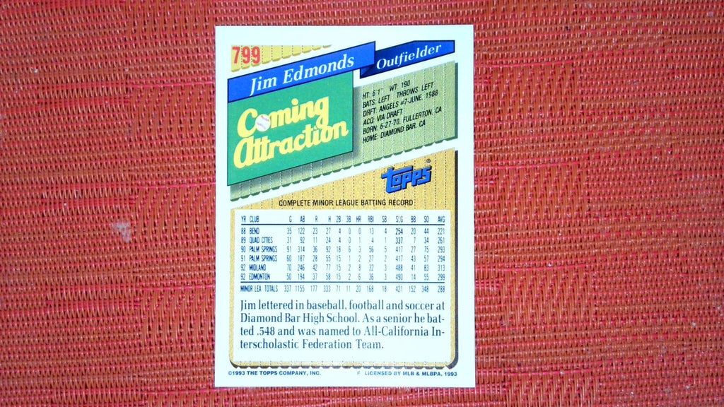 This is a nice example of a 1993 Topps #799 Jim Edmonds Gold.