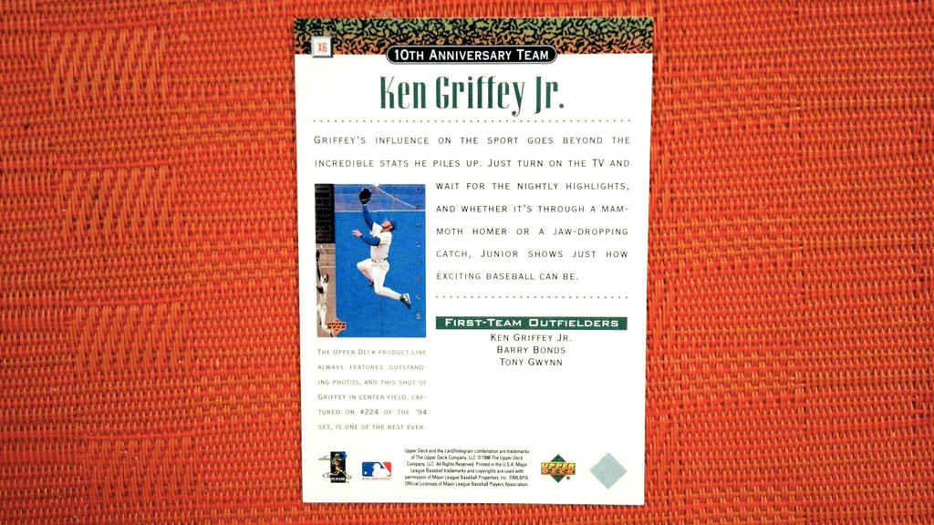 This is a nice example of a 1999 Upper Deck #X6 Ken Griffey Jr. 10th Anniversary Team.