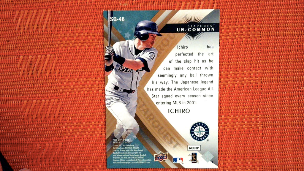 This is a nice example of a 2008 Upper Deck #SQ-46 Ichiro Suzuki StarQuest Ultra Rare.