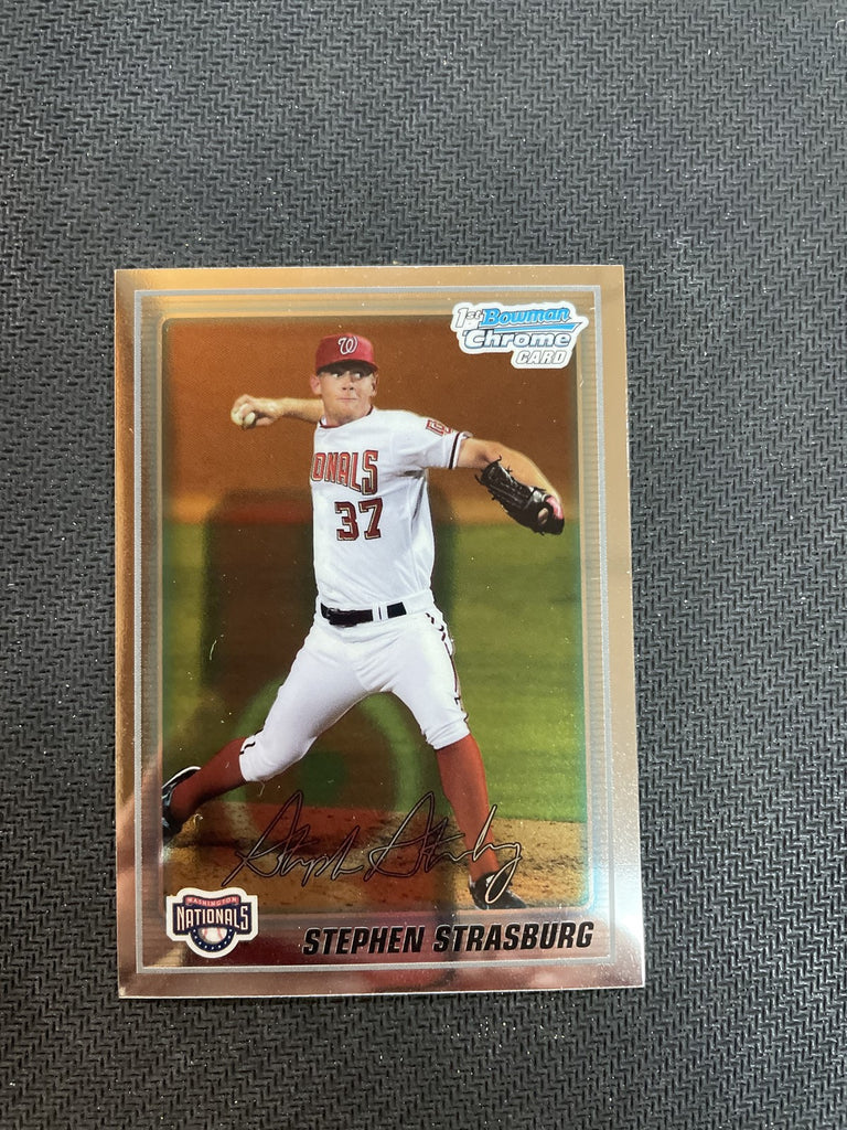 This is a nice example of a 2010 Bowman #BCP1 Stephen Strasburg Chrome Prospects.