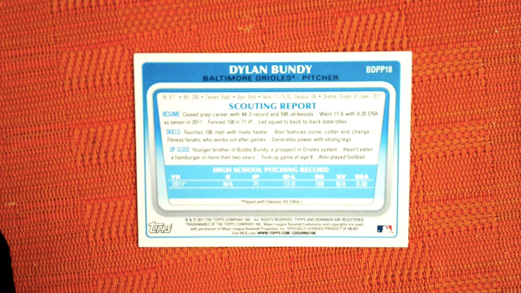 This is a nice example of a 2011 Bowman Draft Picks & Prospects #BDPP18 Dylan Bundy Prospects.