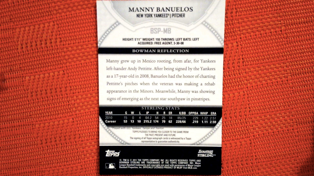 This is a nice example of a 2011 Bowman Sterling #BSP-MB Manny Banuelos Prospect Autographs.
