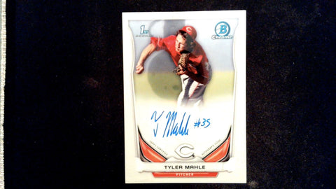This is a nice example of a 2014 Bowman Chrome #BCAP-TMA Tyler Mahle Prospect Autographs. The card is right out of the pack. We will combine shipping. Sales tax is applied to Maryland residents. Free shipping orders less than $20 will be shipped PWE.Other important information about this card: In 2014 Tyler Mahle played for the Cincinnati Reds.Please check out our other listings for more great cards.