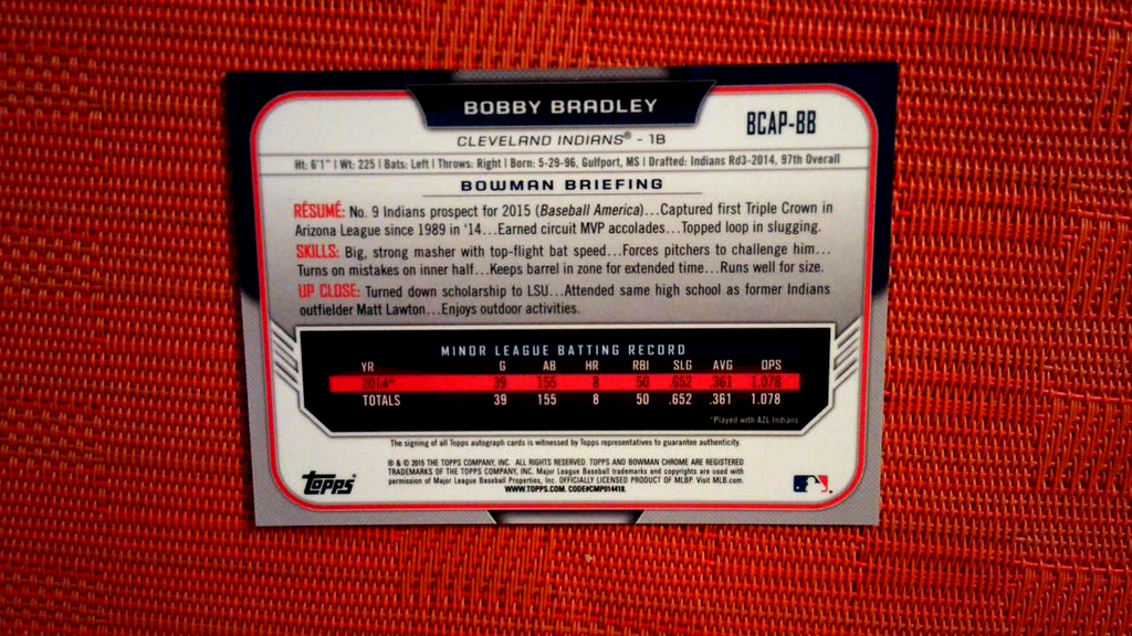 2015 Bowman Chrome Prospects Auto #BCAP-BB Bobby Bradley RC Rookie Mint Indians
