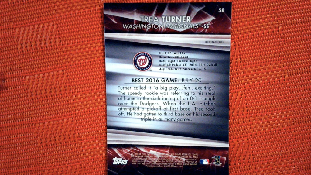 This is a nice example of a 2016 Bowman's Best #58 Trea Turner Refractor.
