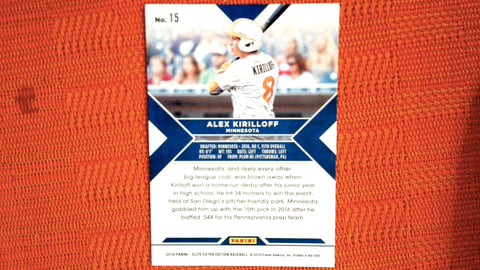This is a nice example of a 2016 Panini Elite Extra Edition #15 Alex Kirilloff Aspirations Purple.