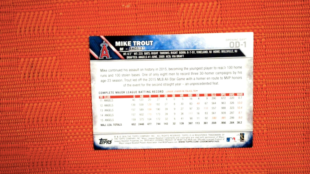 This is a nice example of a 2016 Topps Opening Day #OD-1 Mike Trout .