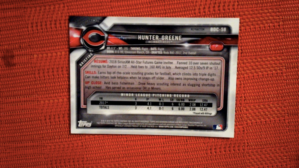 This is a nice example of a 2018 Bowman Draft #BDC-58 Hunter Greene Chrome.