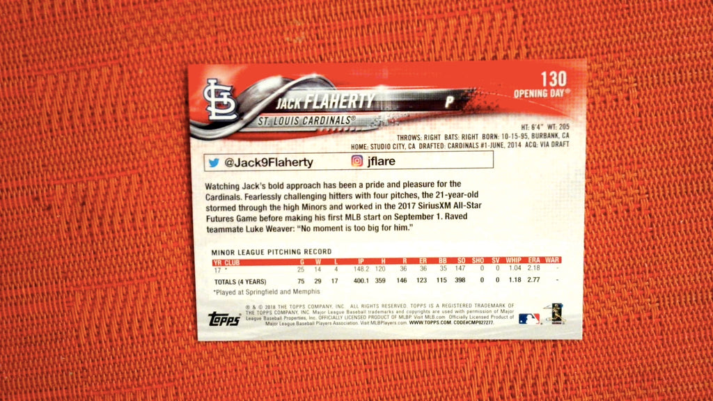 This is a nice example of a 2018 Topps Opening Day #130 Jack Flaherty .