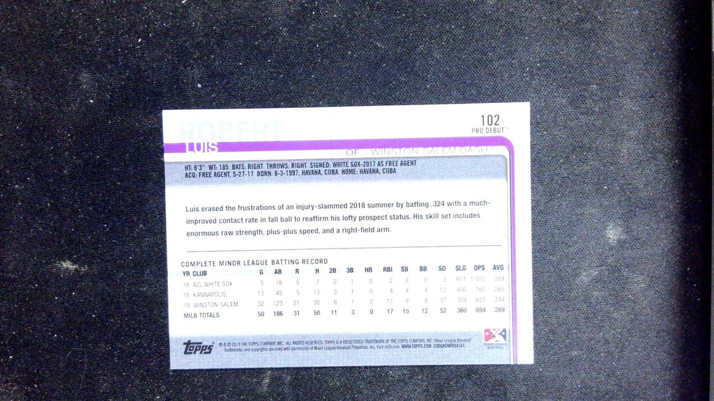 This is a nice example of a 2019 Topps Pro Debut #102 Luis Robert . The card is right out of the pack. We will combine shipping. Sales tax is applied to Maryland residents. Free shipping orders less than $20 will be shipped PWE.Other important information about this card: In 2019 Luis Robert played for the Winston-Salem Dash.Please check out our other listings for more great cards.
