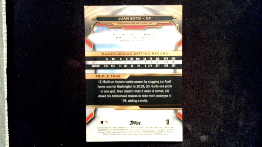 This is a nice example of a 2019 Topps Triple Threads #96 Juan Soto Amethyst. The card is right out of the pack. We will combine shipping. Sales tax is applied to Maryland residents. Free shipping orders less than $20 will be shipped PWE.Other important information about this card: In 2019 Juan Soto played for the Washington Nationals.Please check out our other listings for more great cards.