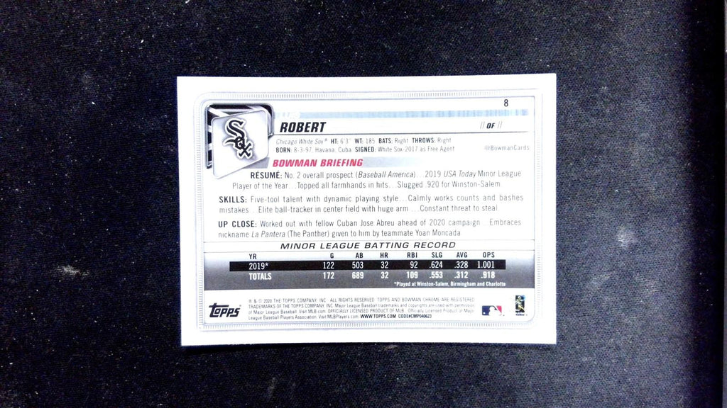 This is a nice example of a 2020 Bowman Chrome #8 Luis Robert . The card is right out of the pack. We will combine shipping. Sales tax is applied to Maryland residents. Free shipping orders less than $20 will be shipped PWE.Other important information about this card: In 2020 Luis Robert played for the Chicago White Sox.Please check out our other listings for more great cards.