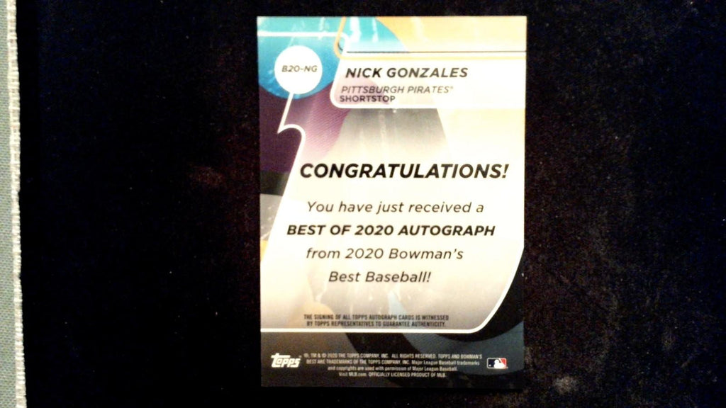 This is a nice example of a 2020 Bowman's Best #B20-NG Nick Gonzales Best of 2020 Autographs. The card is right out of the pack. We will combine shipping. Sales tax is applied to Maryland residents. Free shipping orders less than $20 will be shipped PWE.Other important information about this card: In 2020 Nick Gonzales played for the Pittsburgh Pirates.Please check out our other listings for more great cards.