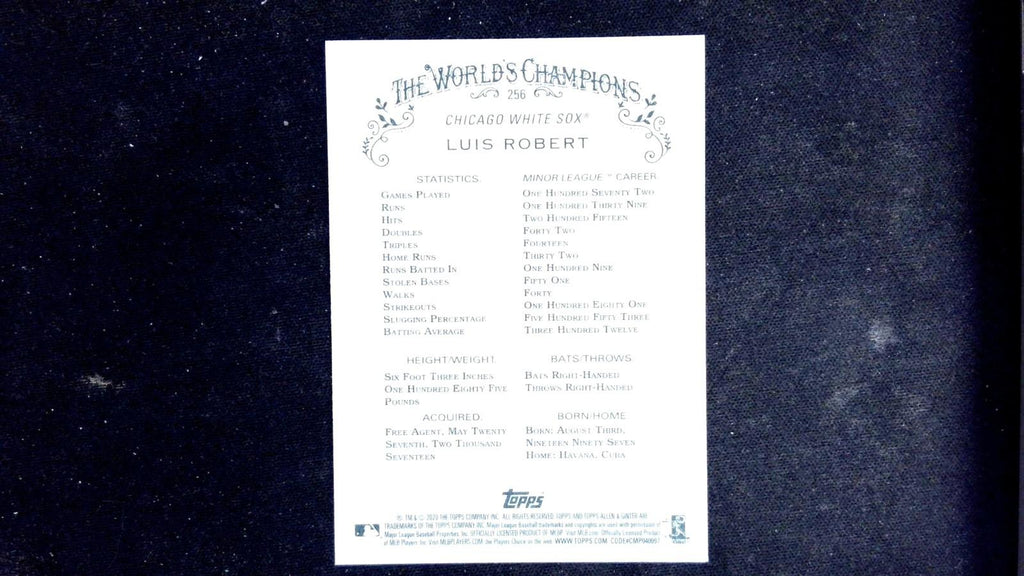 This is a nice example of a 2020 Topps Allen & Ginter #256 Luis Robert . The card is right out of the pack. We will combine shipping. Sales tax is applied to Maryland residents. Free shipping orders less than $20 will be shipped PWE.Other important information about this card: In 2020 Luis Robert played for the Chicago White Sox.Please check out our other listings for more great cards.