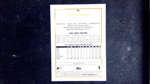 This is a nice example of a 2020 Topps Gallery #144 Luis Robert . The card is right out of the pack. We will combine shipping. Sales tax is applied to Maryland residents. Free shipping orders less than $20 will be shipped PWE.Other important information about this card: In 2020 Luis Robert played for the Chicago White Sox.Please check out our other listings for more great cards.