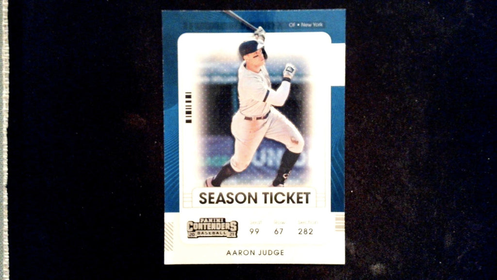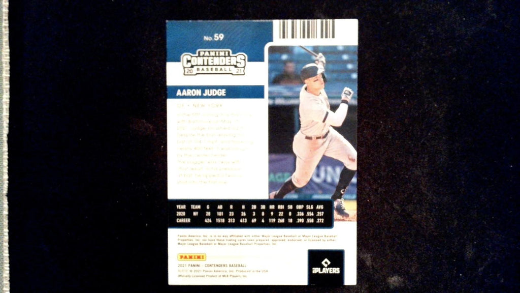 This is a nice example of a 2021 Panini Contenders #59 Aaron Judge . The card is right out of the pack. We will combine shipping. Sales tax is applied to Maryland residents. Free shipping orders less than $20 will be shipped PWE.Other important information about this card: In 2021 Aaron Judge played for the New York Yankees.Please check out our other listings for more great cards.