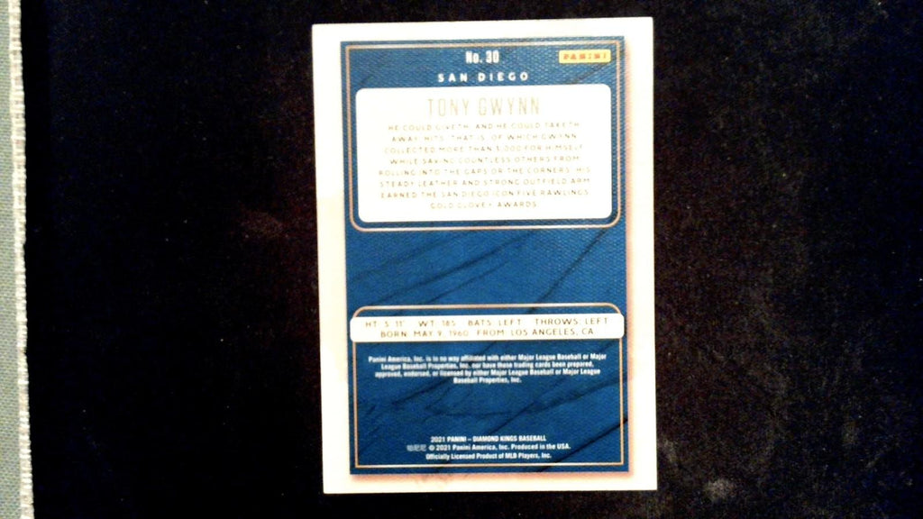 This is a nice example of a 2021 Panini Diamond Kings #30 Tony Gwynn . The card is right out of the pack. We will combine shipping. Sales tax is applied to Maryland residents. Free shipping orders less than $20 will be shipped PWE.Other important information about this card: In 2021 Tony Gwynn played for the San Diego Padres.Please check out our other listings for more great cards.