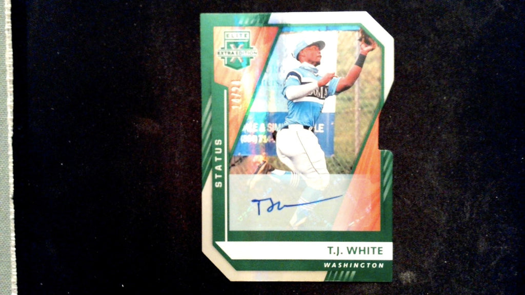 This is a nice example of a 2021 Panini Elite Extra Edition #143 T.J. White Signatures Status Die Cut. The card is right out of the pack. We will combine shipping. Sales tax is applied to Maryland residents. Free shipping orders less than $20 will be shipped PWE.Other important information about this card: In 2021 T.J. White played for the Washington Nationals.Please check out our other listings for more great cards.