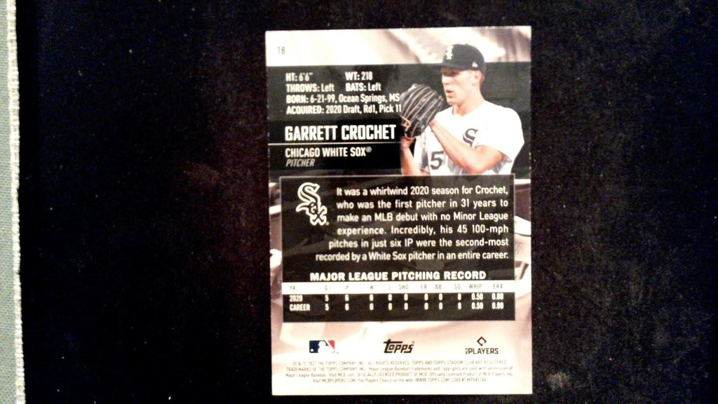 This is a nice example of a 2021 Stadium Club #18 Garrett Crochet . The card is right out of the pack. We will combine shipping. Sales tax is applied to Maryland residents. Free shipping orders less than $20 will be shipped PWE.Other important information about this card: In 2021 Garrett Crochet played for the Chicago White Sox.Please check out our other listings for more great cards.