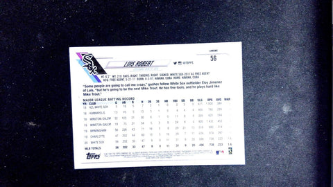 This is a nice example of a 2021 Topps Chrome #56 Luis Robert . The card is right out of the pack. We will combine shipping. Sales tax is applied to Maryland residents. Free shipping orders less than $20 will be shipped PWE.Other important information about this card: In 2021 Luis Robert played for the Chicago White Sox.Please check out our other listings for more great cards.