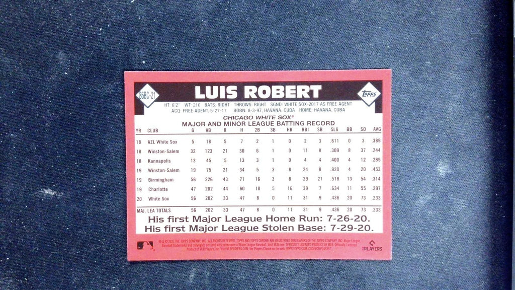 This is a nice example of a 2021 Topps Chrome #86BC-21 Luis Robert 1986 Topps Baseball 35th Anniversary. The card is right out of the pack. We will combine shipping. Sales tax is applied to Maryland residents. Free shipping orders less than $20 will be shipped PWE.Other important information about this card: In 2021 Luis Robert played for the Chicago White Sox.Please check out our other listings for more great cards.