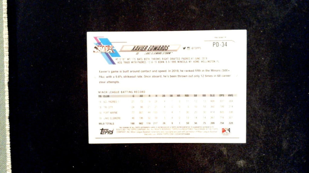 This is a nice example of a 2021 Topps Pro Debut #PD-34 Xavier Edwards Autographs. The card is right out of the pack. We will combine shipping. Sales tax is applied to Maryland residents. Free shipping orders less than $20 will be shipped PWE.Other important information about this card: In 2021 Xavier Edwards played for the Lake Elsinore Storm.Please check out our other listings for more great cards.