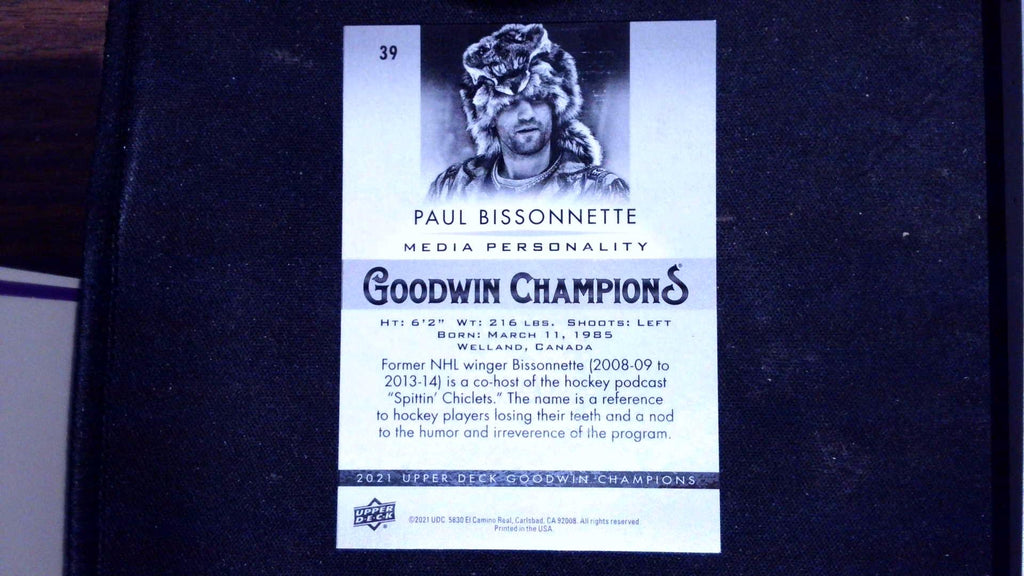 This is a nice example of a 2021 Upper Deck Goodwin Champions #39 Paul Bissonnette Platinum Rainbow.