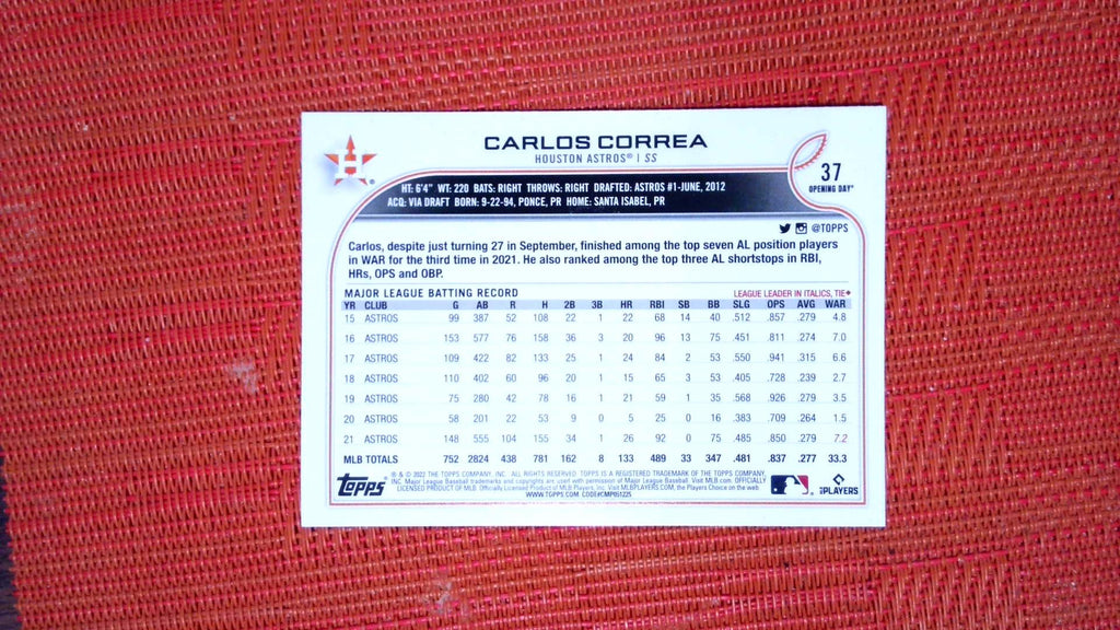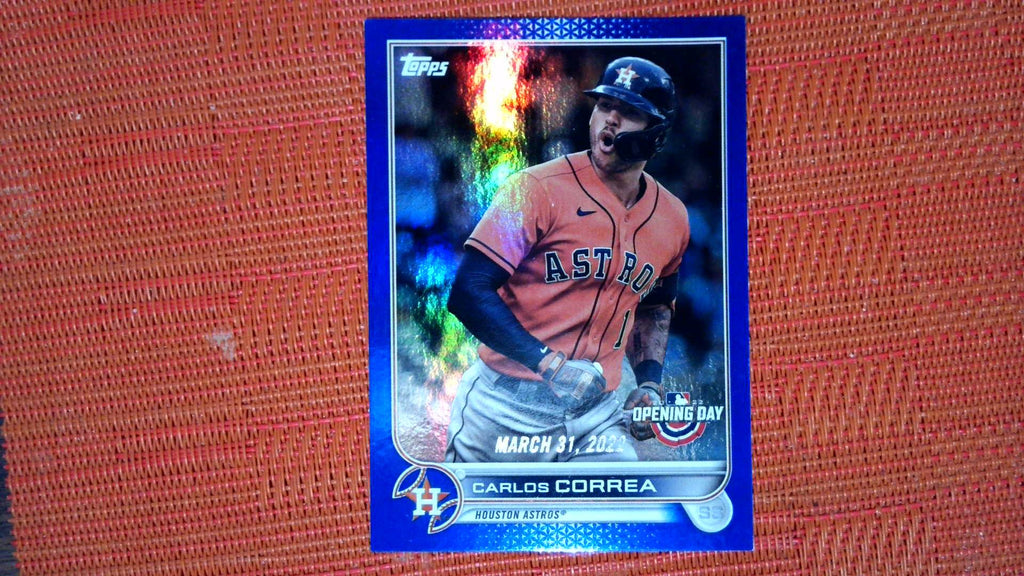 This is a nice example of a 2022 Topps Opening Day #37 Carlos Correa Blue Foil.