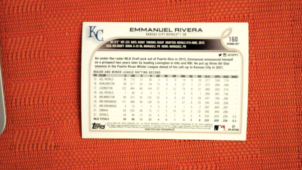 2022 Topps Opening Day Opening Day Blue Foil #160 Emmanuel Rivera Rookie /2022