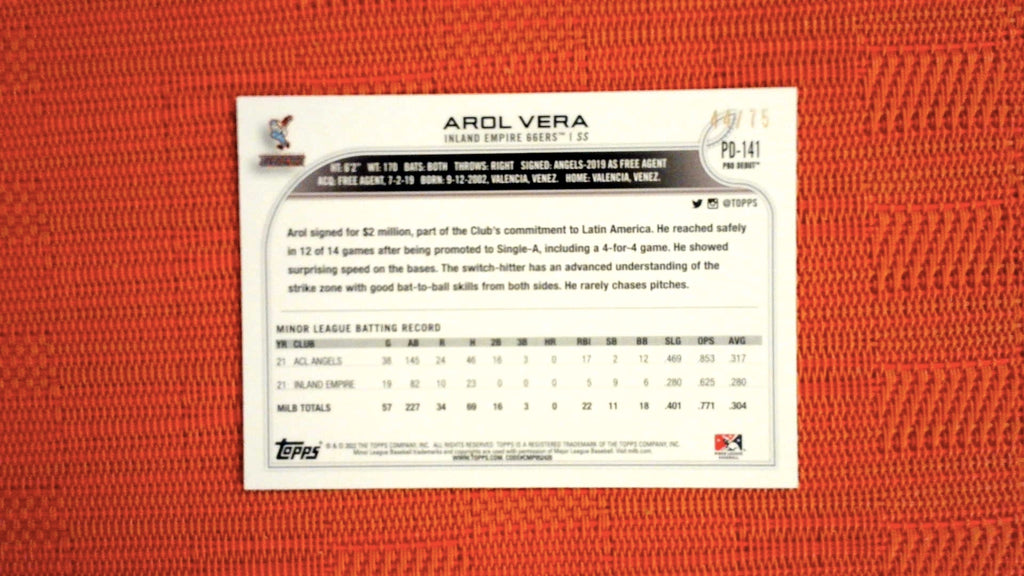 2022 Topps Pro Debut Aqua #PD-141 Arol Vera 44/75
