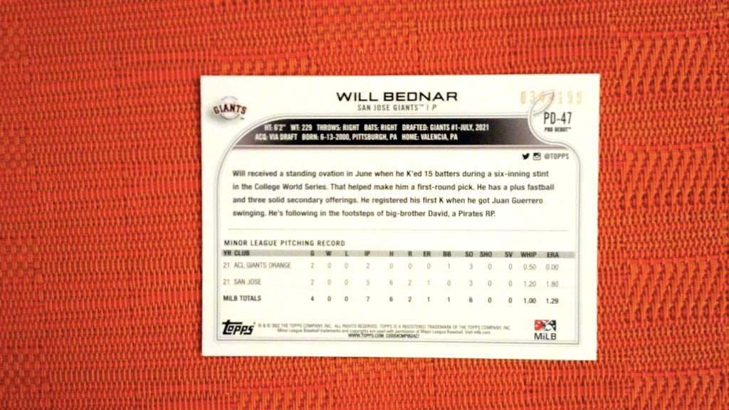 2022 Topps Pro Debut Fuchsia #PD-47 Will Bednar 34/199