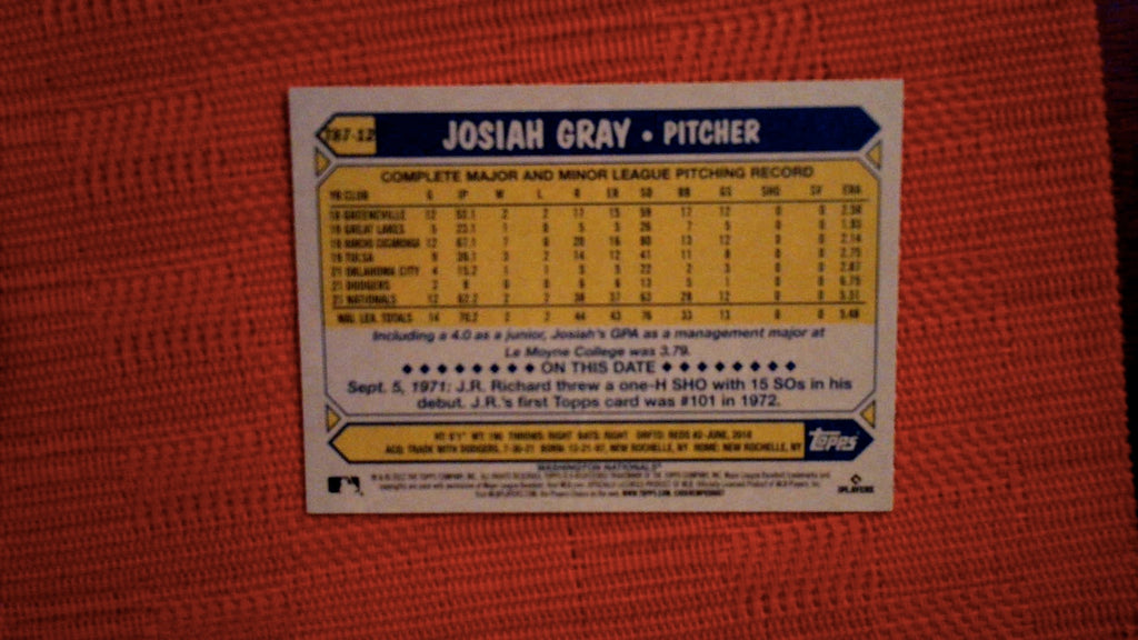 2022 Topps Series 1 1987 Topps Baseball 35th Anniversary Set #T87-12 Josiah Gray Rookie Baseball