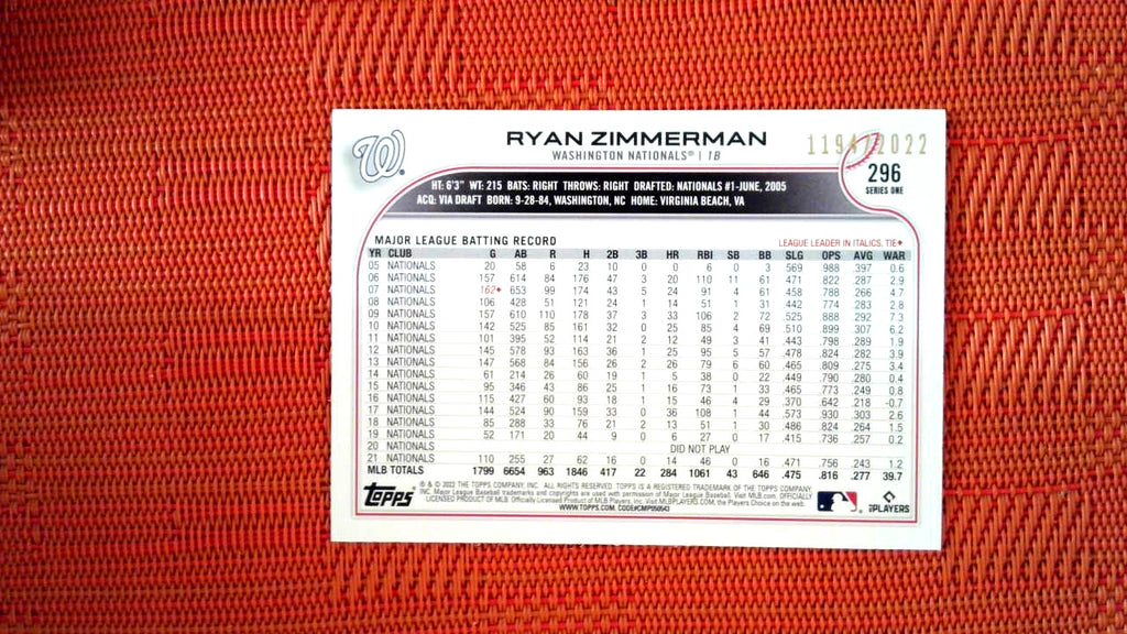 2022 Topps Series 1 Baseball #296 Ryan Zimmerman Gold 1194/2022