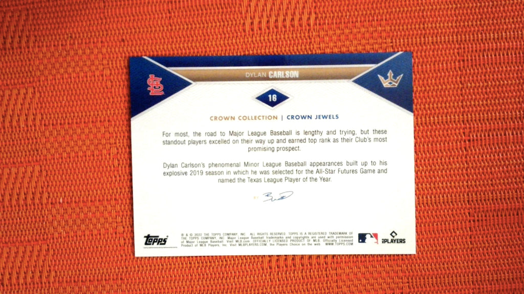 This is a nice example of a 2022 Topps x Bobby Witt Jr. Crown Collection #16 Dylan Carlson .