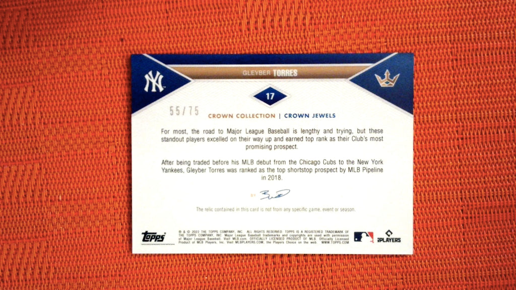 This is a nice example of a 2022 Topps x Bobby Witt Jr. Crown Collection #17 Gleyber Torres Crown Jewel Relics Green Rainbow.
