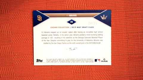 This is a nice example of a 2022 Topps x Bobby Witt Jr. Crown Collection #28 CJ Abrams Purple Rainbow.