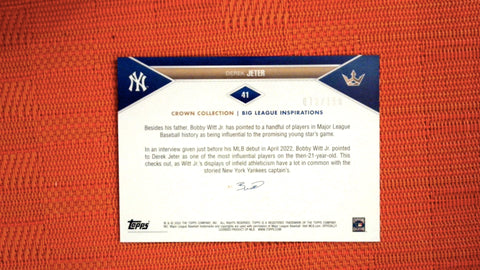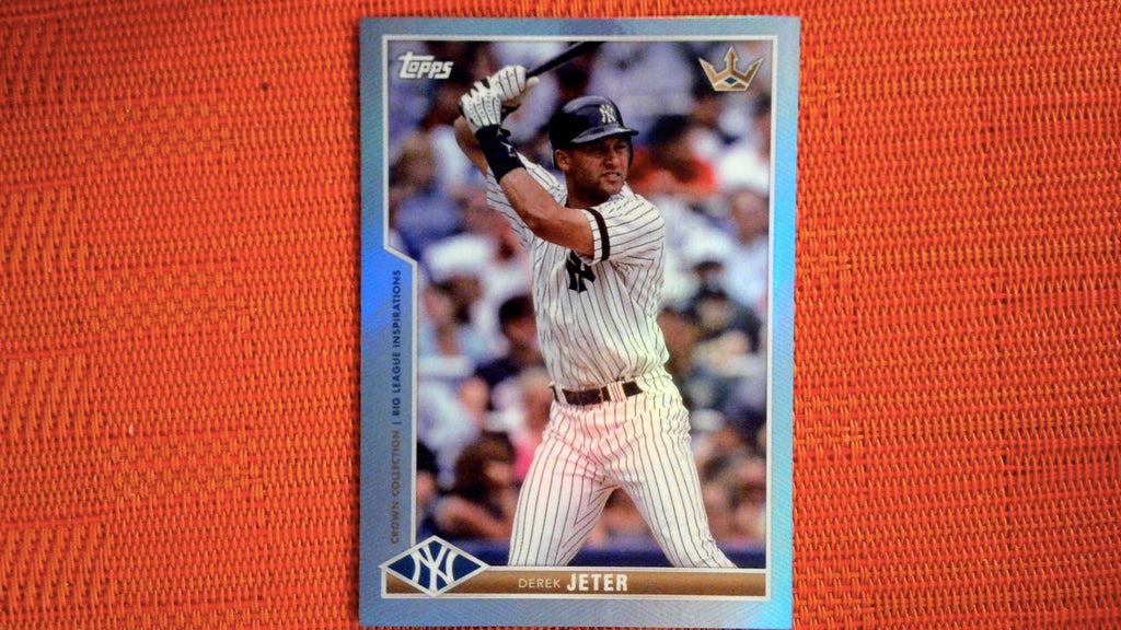 This is a nice example of a 2022 Topps x Bobby Witt Jr. Crown Collection #41 Derek Jeter Royals Light Blue.