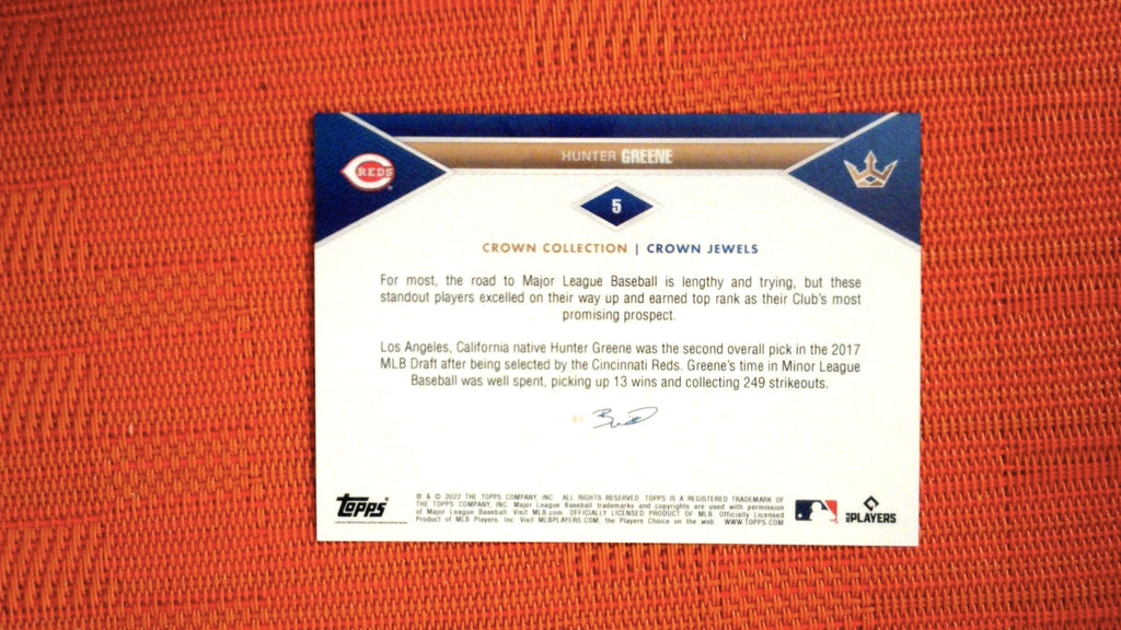 This is a nice example of a 2022 Topps x Bobby Witt Jr. Crown Collection #5 Hunter Greene .