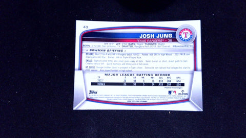 This is a nice example of a 2023 Bowman #43 Josh Jung Mojo Refractors.