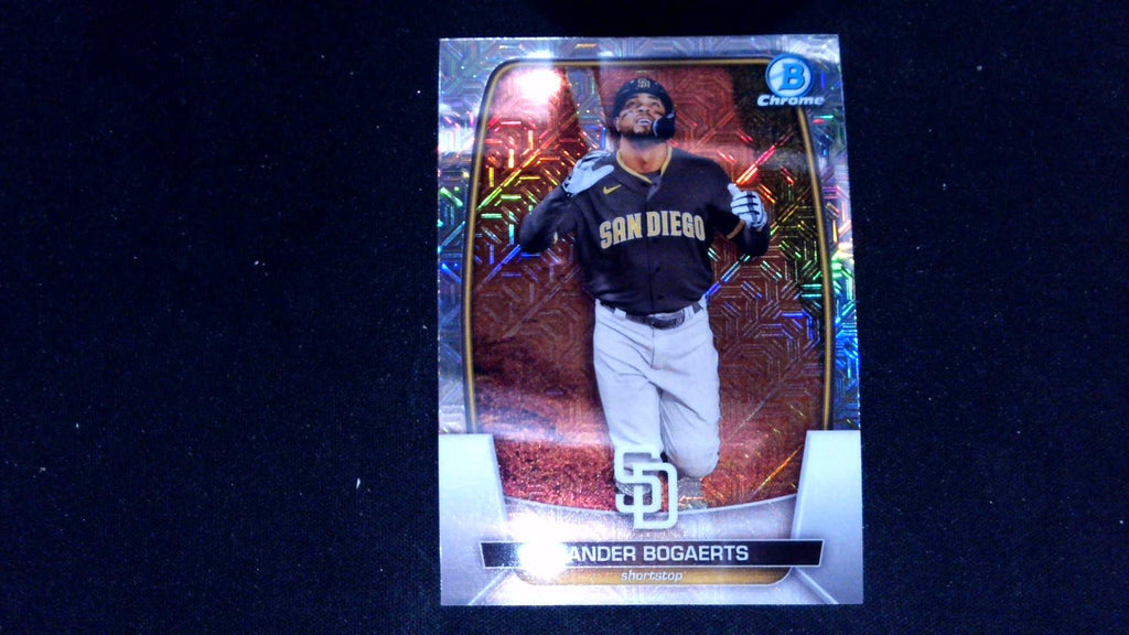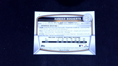 This is a nice example of a 2023 Bowman #7 Xander Bogaerts Mojo Refractors.