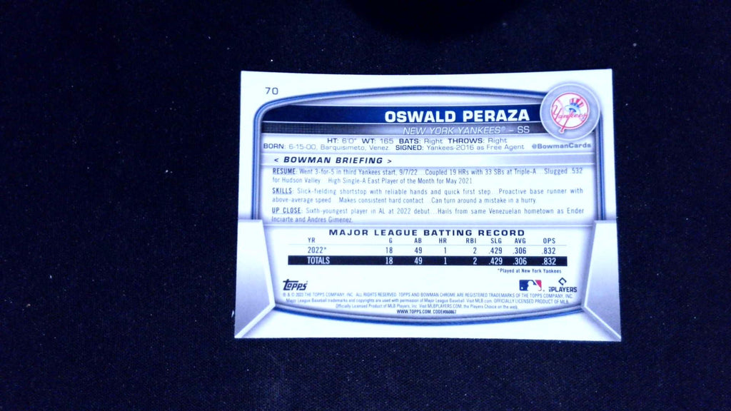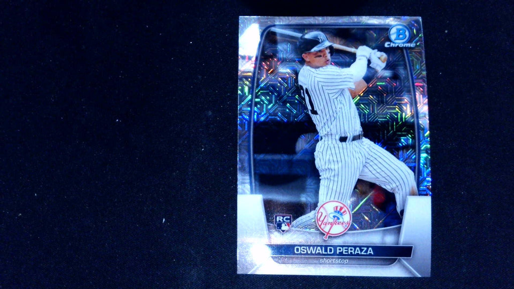 This is a nice example of a 2023 Bowman #70 Oswald Peraza Mojo Refractors.