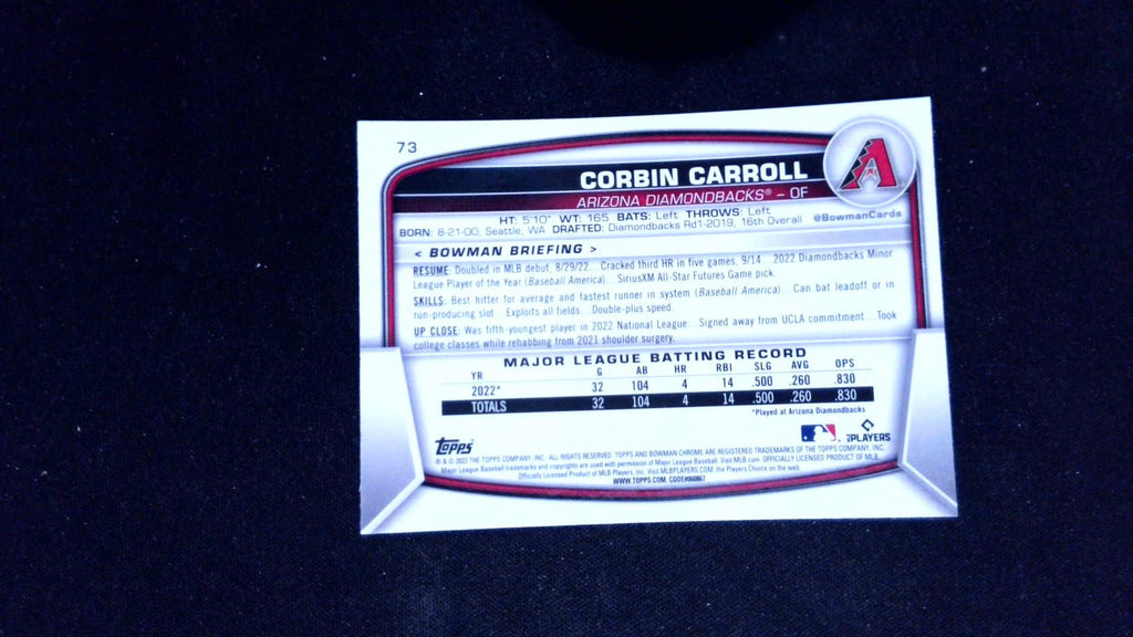 This is a nice example of a 2023 Bowman #73 Corbin Carroll Mojo Refractors.
