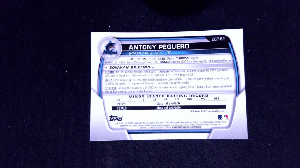 This is a nice example of a 2023 Bowman #BCP-62 Antony Peguero Chrome Prospects.