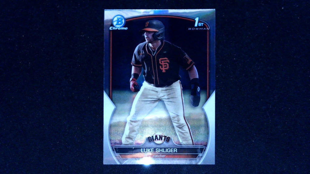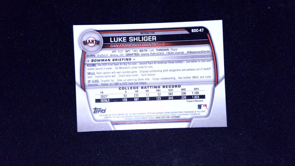 This is a nice example of a 2023 Bowman Draft #BDC-47 Luke Shliger Chrome Refractor.