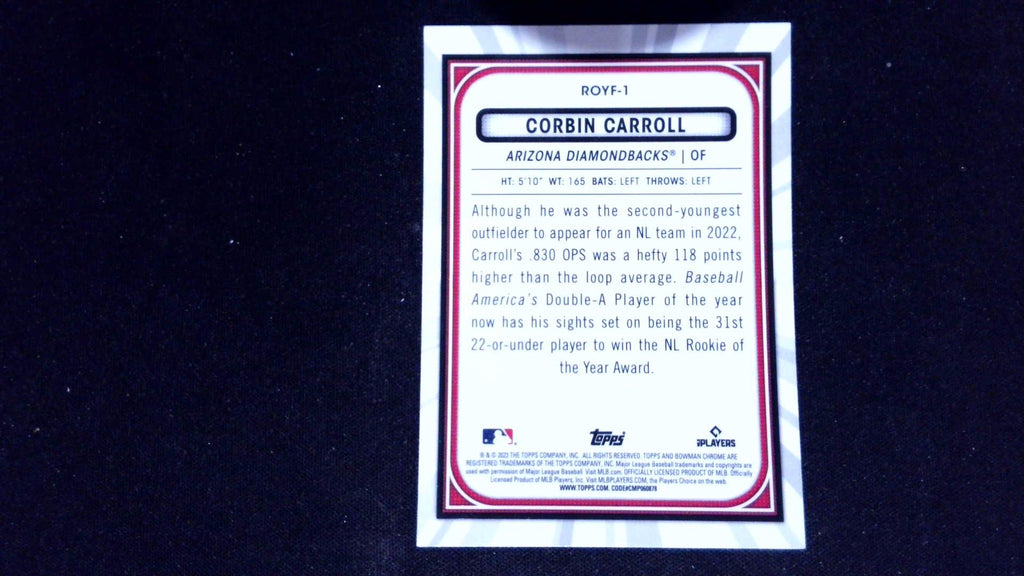 This is a nice example of a 2023 Bowman #ROYF-1 Corbin Carroll Rookie of the Year Favorites Mojo.