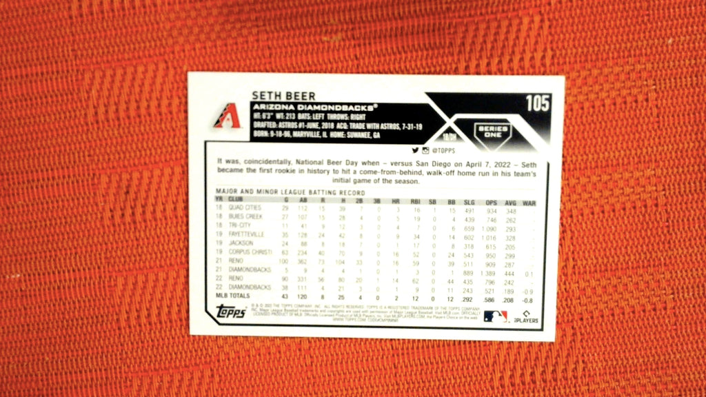 This is a nice example of a 2023 Topps #105 Seth Beer Gold Foil.