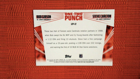 This is a nice example of a 2023 Topps #12P-22 Bob Gibson / Steve Carlton One-Two Punch.