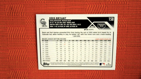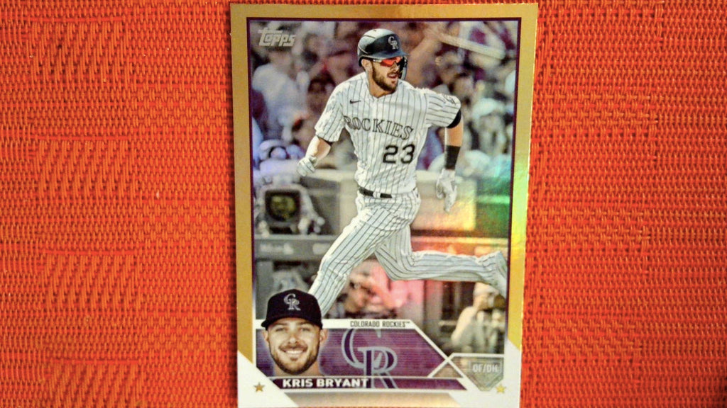 This is a nice example of a 2023 Topps #158 Kris Bryant Gold Foil.
