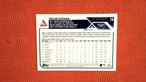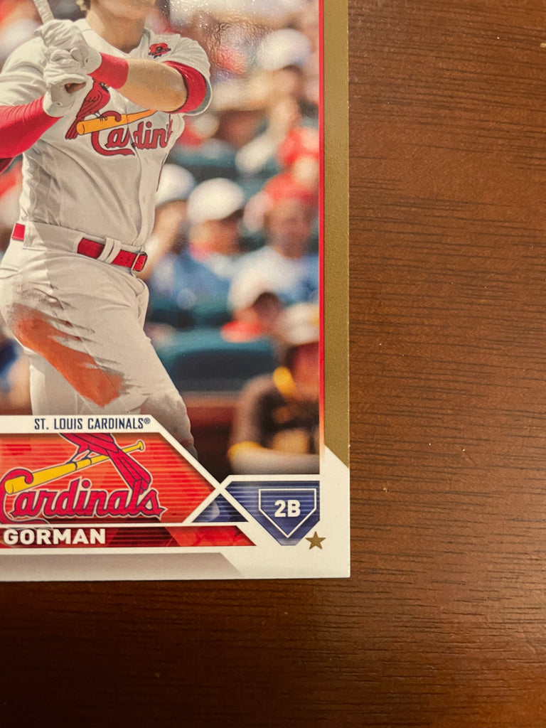 This is a nice example of a 2023 Topps #16 Nolan Gorman Gold.