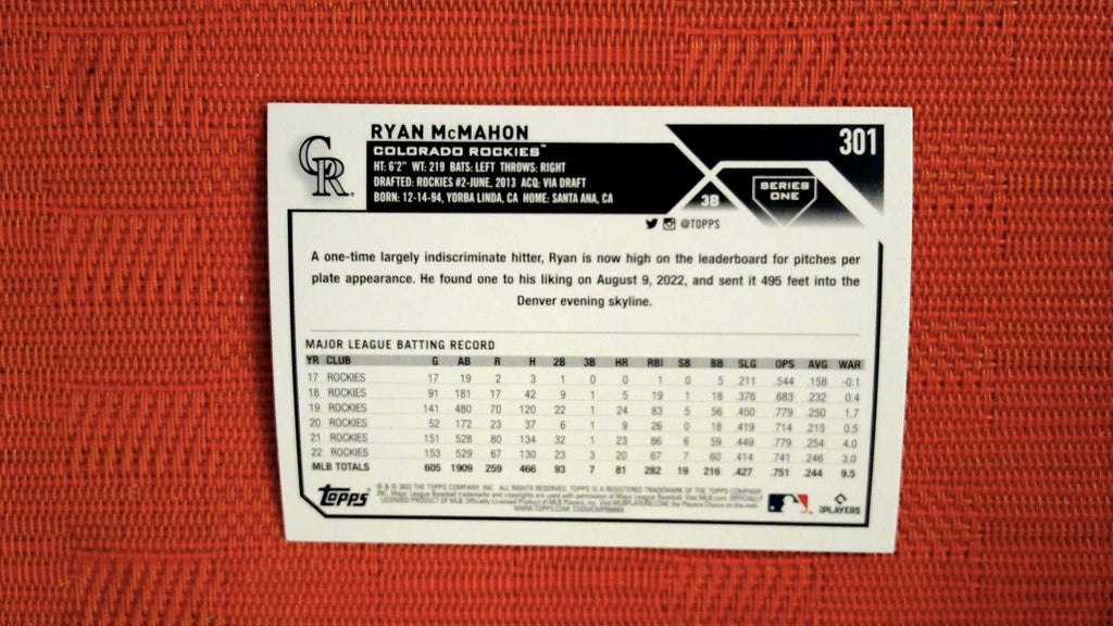 This is a nice example of a 2023 Topps #301 Ryan McMahon Gold Foil.